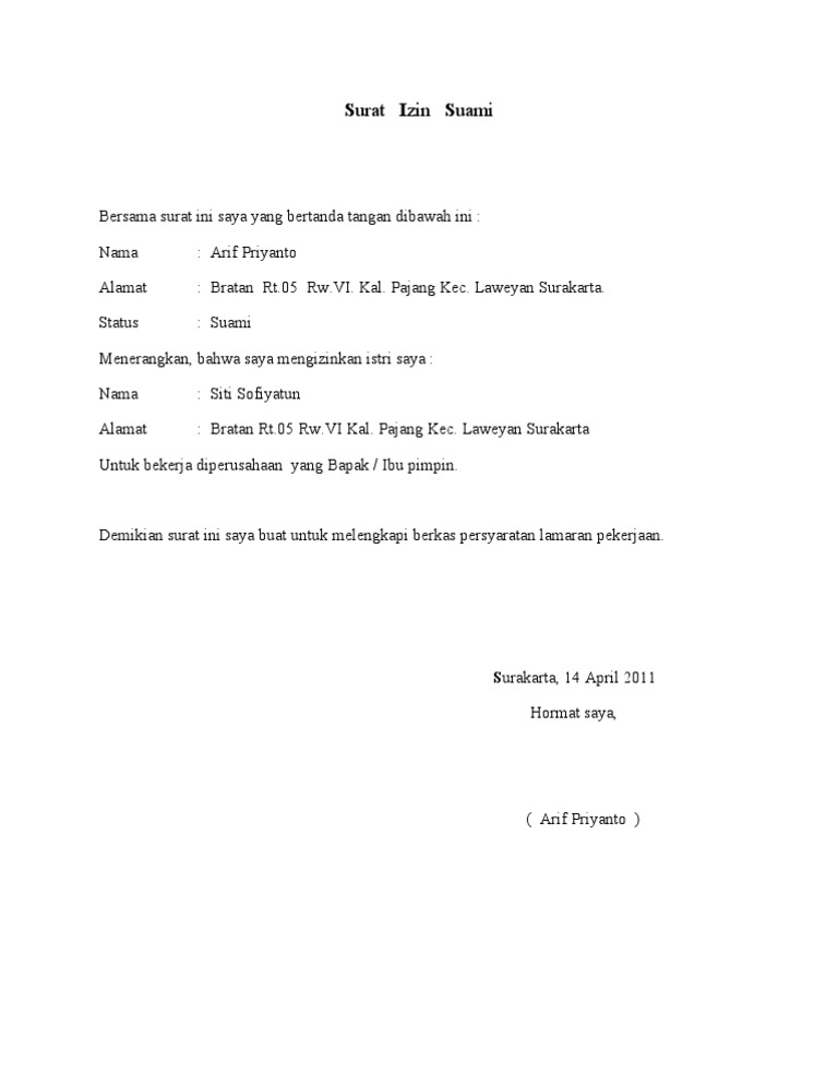 Contoh Surat Izin Suami Untuk Sekolah Surat Perkerjaan